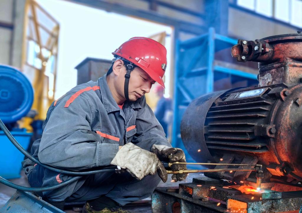 圖為機(jī)電科機(jī)修工王雷正在焊接電機(jī)