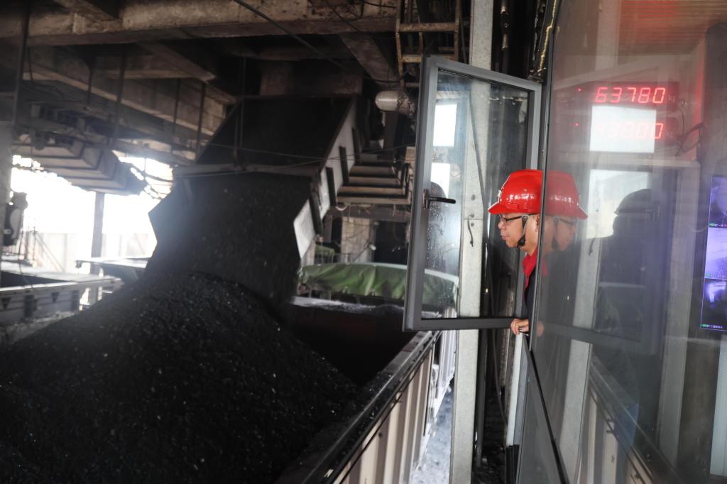 圖為該礦供應(yīng)銷售部職工呂運(yùn)賀正在監(jiān)裝原煤外運(yùn)裝車情況。