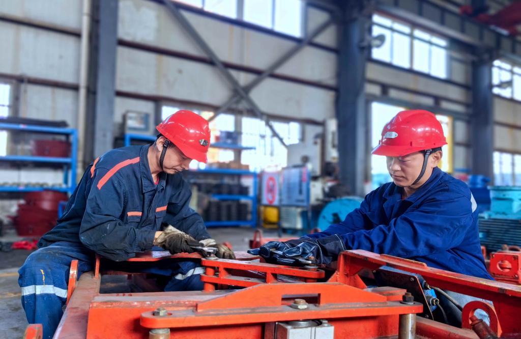 圖為機(jī)電科機(jī)修工胡天彬和戴鐵錘正在維修單軌吊氣動道岔