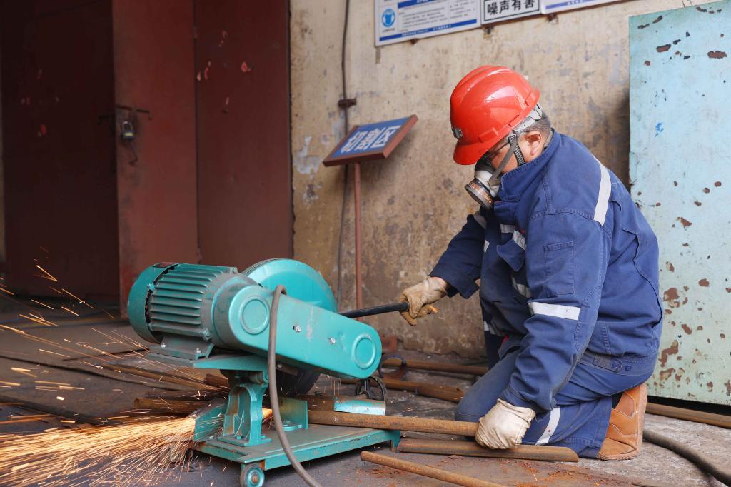 圖為該礦機(jī)電科(機(jī)廠)職工曹輝正在切割加工材料。