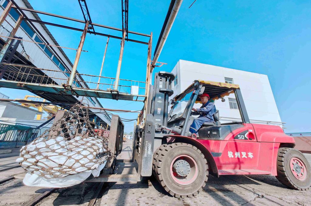 圖為運(yùn)輸區(qū)叉車司機(jī)張振正在叉運(yùn)物料
