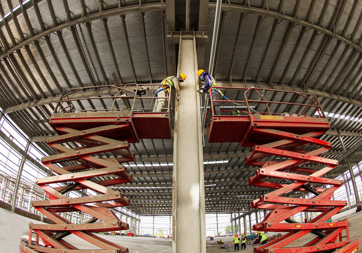 5月11日,工人借助升降車對(duì)廣聚物流園區(qū)廠房鋼結(jié)構(gòu)進(jìn)行防火涂層施工