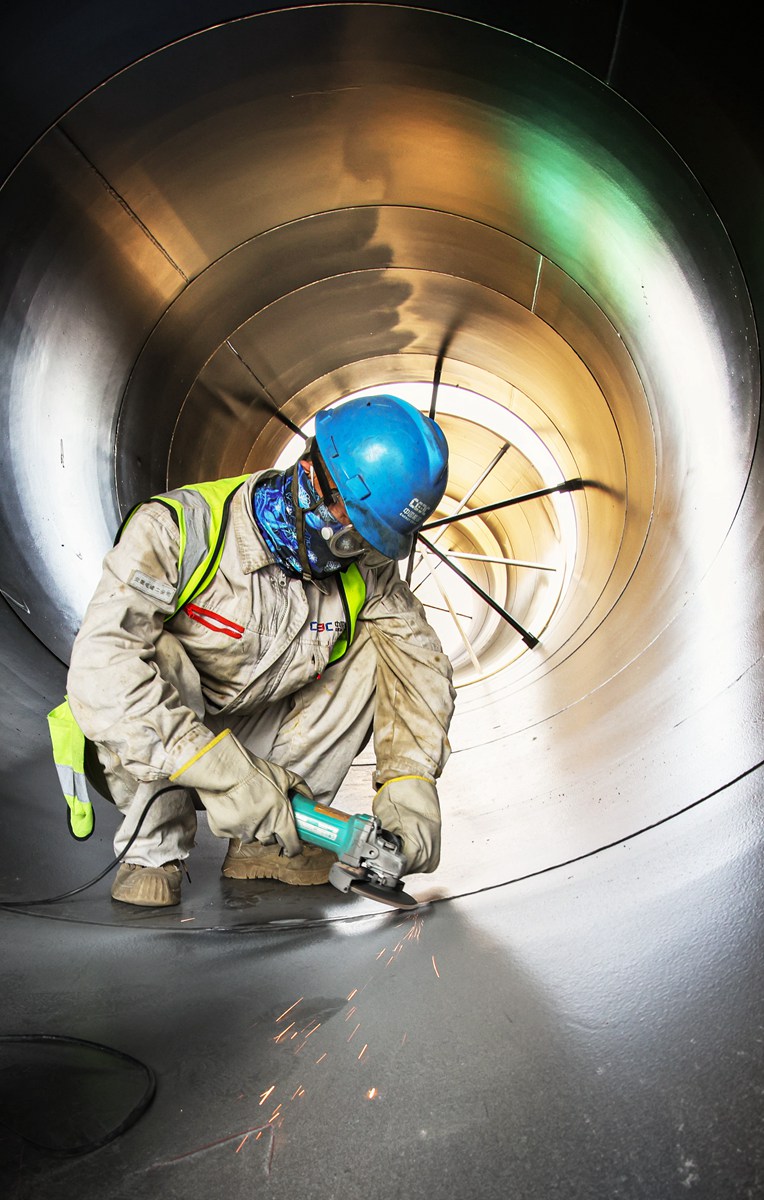 5月13日,在聚能發(fā)電公司施工現(xiàn)場(chǎng),工人對(duì)循環(huán)水管焊縫進(jìn)行拋光處理