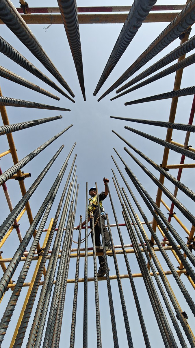 5月13日,工人在聚能發(fā)電公司機(jī)組項(xiàng)目建設(shè)現(xiàn)場(chǎng)綁扎鋼筋