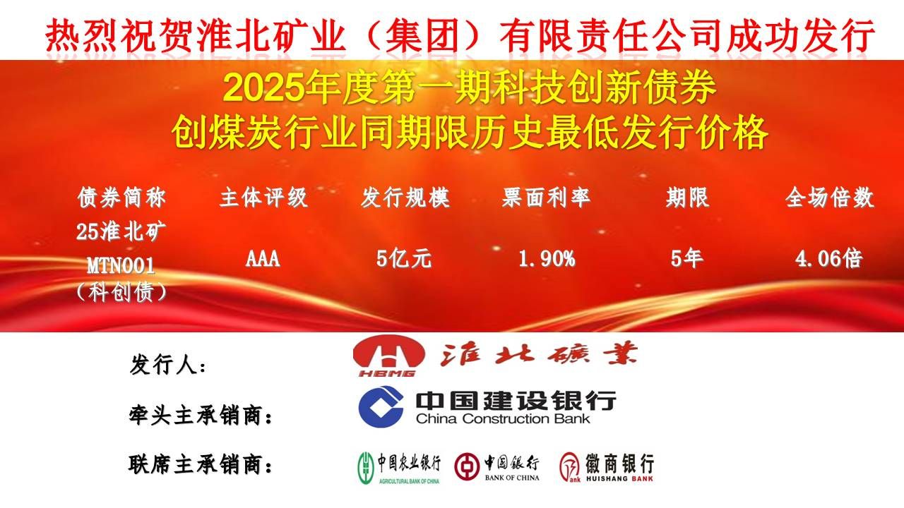2025年7月8日,淮北礦業(yè)集團在銀行間市場成功發(fā)行2025年第一期科技創(chuàng)新債券——25淮北礦MTN001(科創(chuàng)債),發(fā)行規(guī)模5億元,期限5年,票面利率1.90%,全場認購倍數(shù)4.06倍,創(chuàng)煤炭行業(yè)同期限債券價格最低、集團債券票面利率新低,充分顯示資本市場對淮北礦業(yè)集團科技創(chuàng)新實力和高質(zhì)量發(fā)展前景的堅定信心。
