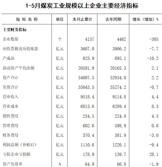 1-5月規(guī)模以上煤炭企業(yè)主要經(jīng)濟(jì)指標(biāo)完成情況