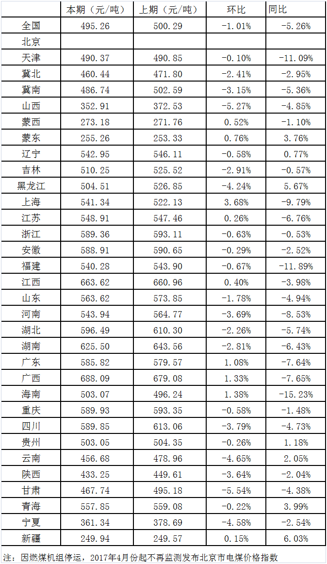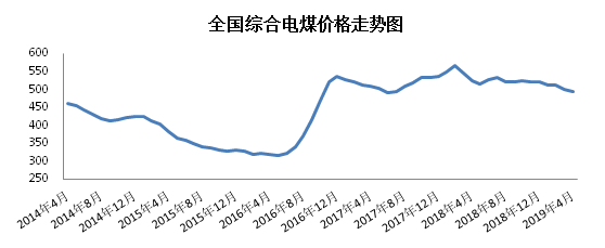 2019年5月15日,國家發(fā)展改革委價格監(jiān)測中心公布4月中國電煤價格指數(shù)為495.26元/噸,環(huán)比下行1.01%,同比下降5.26%。其中,監(jiān)測的31個省市(不含北京市)中,價格下行地區(qū)數(shù)量有22個,下行幅度減弱至27.44元/噸以內(nèi);其他9個地區(qū)電煤價格全部上行,漲幅上行至19.21元/噸以內(nèi)。本月全國煤炭價格活動范圍整體上移,且煤炭價格上下行地區(qū)數(shù)量比例基本維持,說明價格下行區(qū)域活力減弱,而上行幅度擴大。