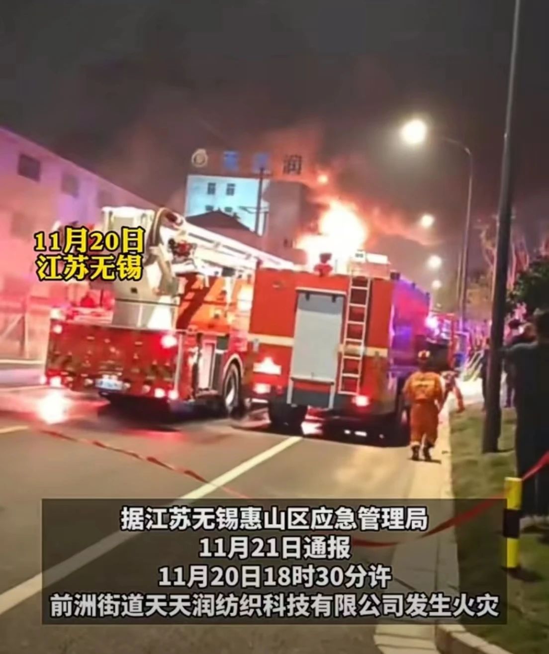 2023年11月20日18時30分許,江蘇省無錫市惠山區前洲街道天天潤紡織科技有限公司發生火災,事故造成7人死亡。