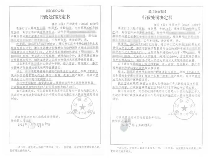 2023年7月,湖北潛江一市場門面房夜間發生火災,兩輛私家車違規停在消防通道上,違停車輛車主不能及時到場,致使消防救援車輛無法進入,情急之下,現場群眾合力將違停車輛抬離。相關部門對兩位私家車主均處以行政拘留五日的處罰